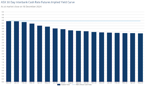 This is key – its 2024 cautious approach is seeing 2025 pivotal shift and the board is now making it clear that its focus of managing inflation risks is starting to switch to addressing growth concerns. Market forecasting has easing beginning at the April meeting, the range from economists is February through to May 2025. Whenever it starts, the consensus between the market and the theorical world is the same – one cut will bring several and come December 2025 the belief is the cash rate will be as low as 3.6%.