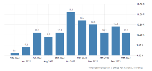 UK’s annual inflation rate decreased from 10.4% to 10.1% in April and remains high. The bank expects inflation to continue falling in Q2 and in the near term.