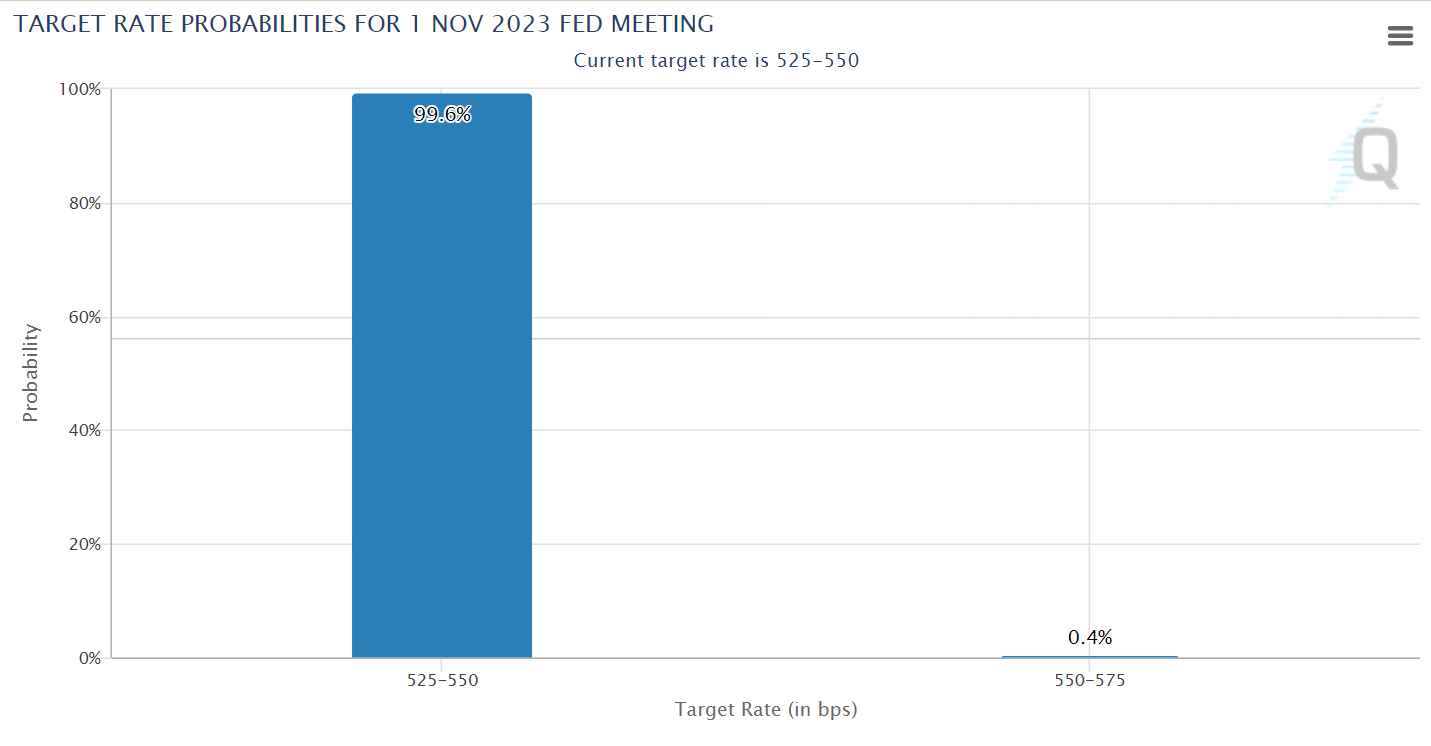 With the rate currently at 5.50%, markets have priced in a hold, with the CME FedWatch Tool giving it a 99.6% probability of the second consecutive hold for the Fed.