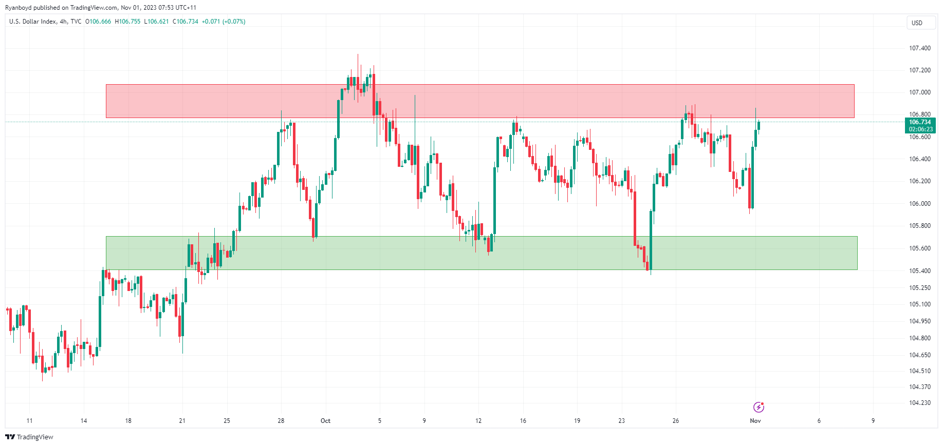 With the US Dollar Currency Index (DXY) bouncing between a range of around 105-107 for the past month, November’s FOMC meeting might be enough to kick it one direction if we see either a Hike or a Cut.