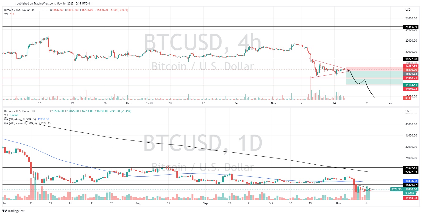 News & AnalysisBitcoin has seen its price plummet after a volatile week largely due to the collapse of Cryptocurrency exchange, FTX. The price of the Bitcoin has fallen to levels not seen since November 2020. The price is now showing signs that it may be in a short-term consolidation before it may sell off again. The downward move may be amplified, especially if it is supported by a news catalyst such as another cryptocurrency exchange going bust or other institutions become entangled in the FTX situation.