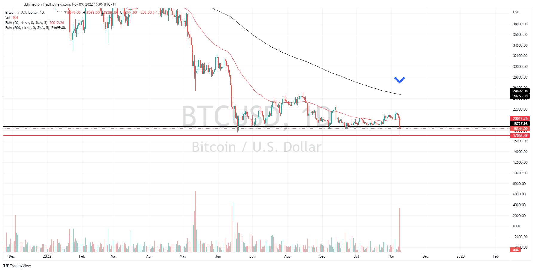 This run has seen the price of Bitcoin fall sharply to its lowest levels since November 2020. The price dumped about USD 2000 as the news hit the market. The price then bounced of the USD 17,000 level to where it now rests near in the mid USD 18,000’s. The volume sold was the highest level since June 2022. Importantly, the price continues to hold its longer term range indicating some level of strength at the USD 18,000 level. There is still a fair bit to play out regarding this potential merger. A failed deal or an accelerated acquisition could either help or hinder the price of Bitcoin and other cryptocurrencies.