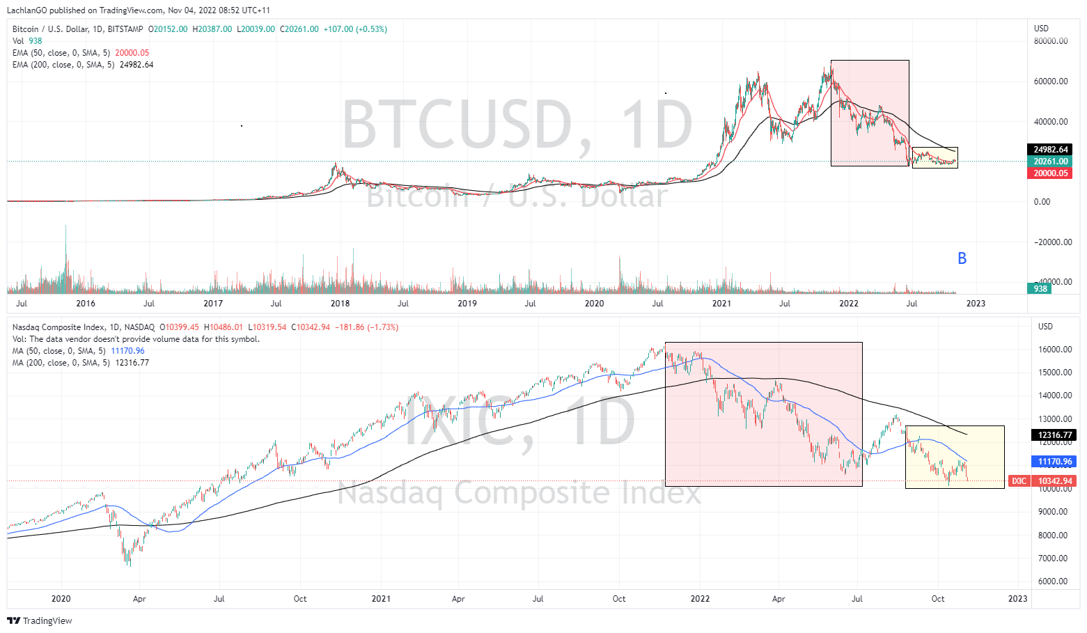 Early on, there was a thought that Bitcoin would become a hedge against inflation, or an alternative to Gold or Oil. With the recent wave of record high inflation that has swept up much of the world the leading cryptocurrency failed this test, and this proved to be wishful thinking. In fact, Bitcoin showed itself to be quite the oppositive of a hedge and was rather much more aligned with growth assets such as the Nasdaq and the technology sector. Prior to May 2022, the Nasdaq and Bitcoin has a correlation of 0.82 out of 1. In addition, with still so much unknown about how governments and Central Banks will come to treat the cryptocurrency and what regulations may be implemented there is a lot of uncertainty about how market regulation will affect the supply and demand. The chart indicates just how correlated the Nasdaq and Bitcoin were, sharing similar peaks in mid-November 2021 and following very similar price action until July 2022. However, after July there has been a shift in the correlation.