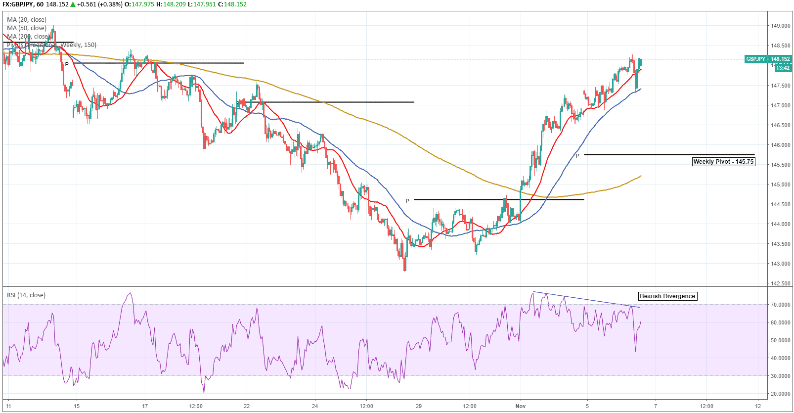 Similar to GBPUSD, I see a potential drop on the horizon for the pair, targeting another weekly pivot. On the hourly chart below, we see evidence of some bearish divergence developing on the RSI (Relative Srength Index), coupled with price teetering around overbought levels. It may well become the fuel that sparks a shift towards the weekly pivot of 145.75.