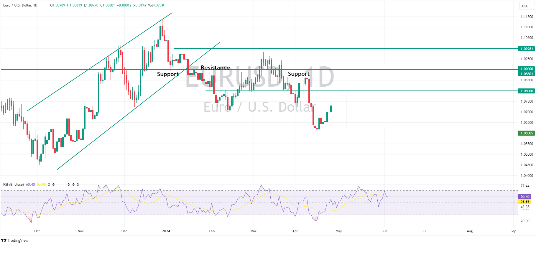 EURUSD has been trading lately It appears that the divergence narrative – triggered by US data and the ECB in-meeting communication – has started to fade slightly, With EURUSD bouncing nicely off support at 1.06 over the last week. Improvements in the eurozone economic outlook probably playing a role in making the hawks reluctant to give in to a dovish policy path. A June cut is still the base case, but the accompanying message may fail to push rates much lower. That potentially limits how far EURUSD can fall on higher USD rates.