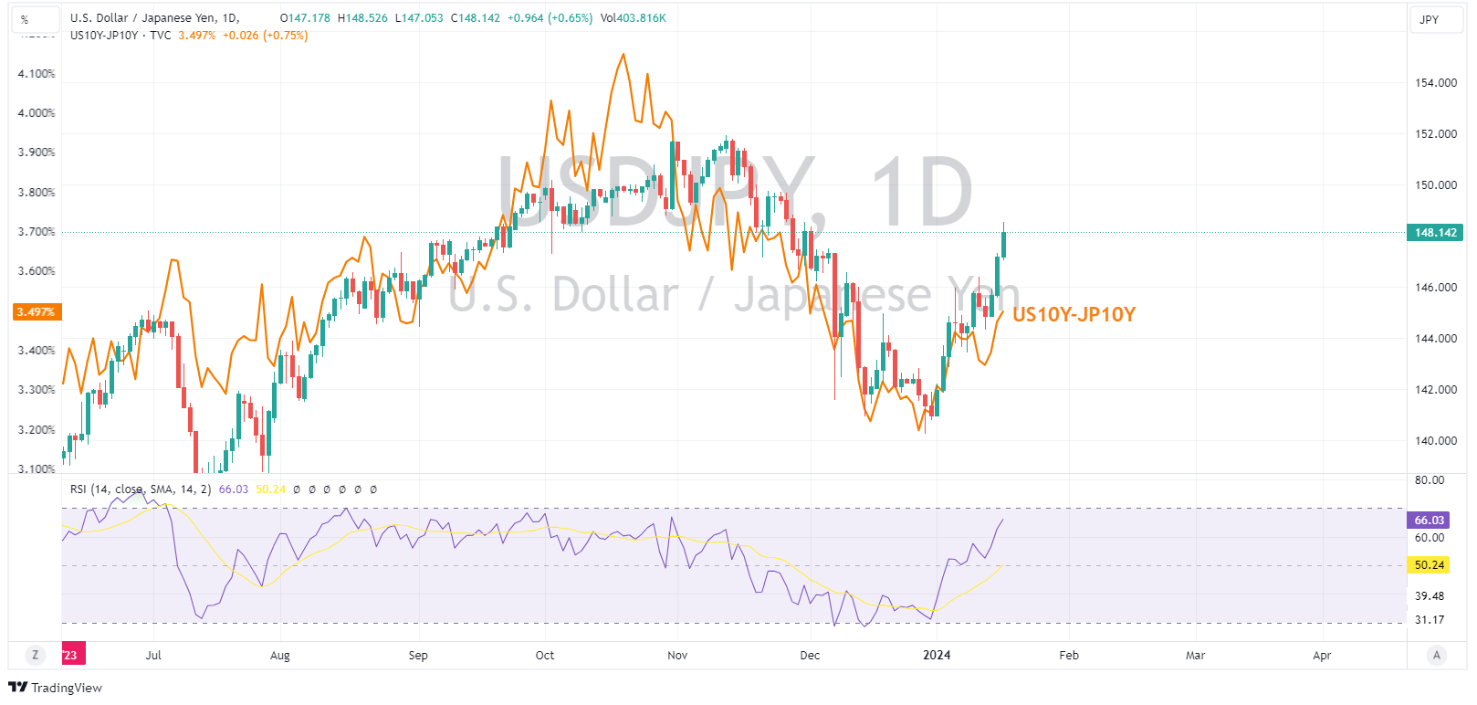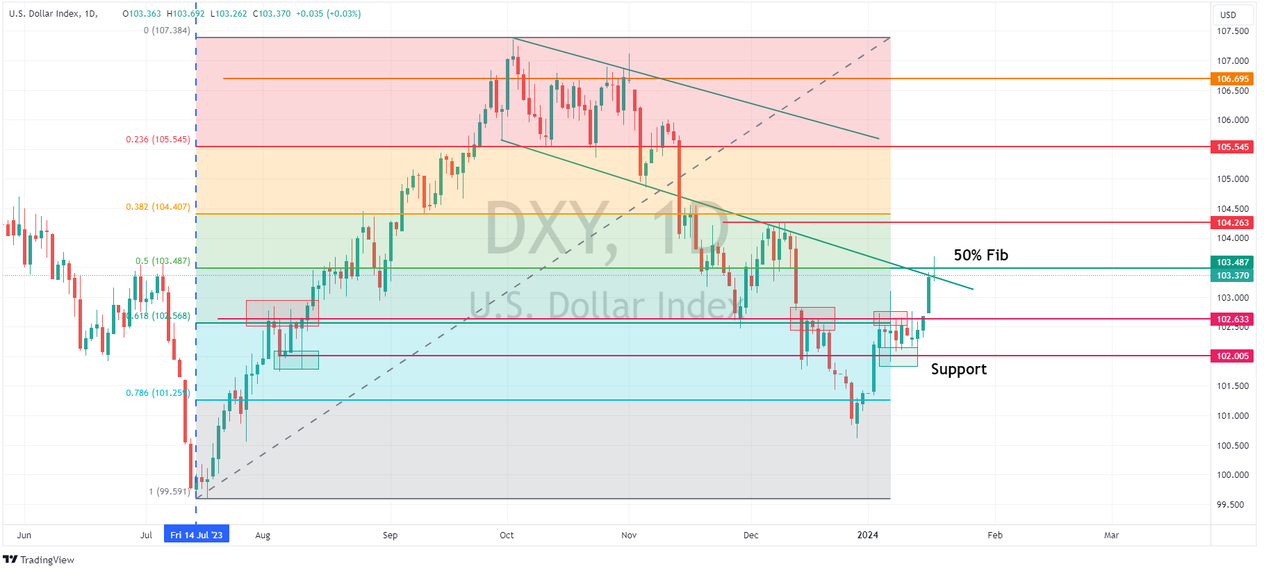 The unwinding of priced in Fed cuts saw a spike in treasury yields and the USD bid, with DXY hitting a high of 103.69 after the December US retail sales report came in hotter than expected. DXY finding resistance at the July-October 50% Fib level before paring gains.