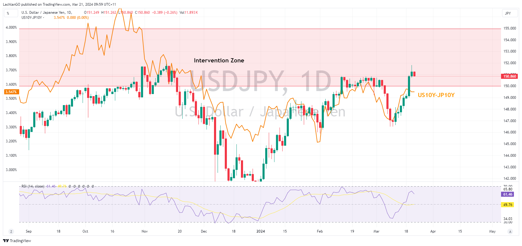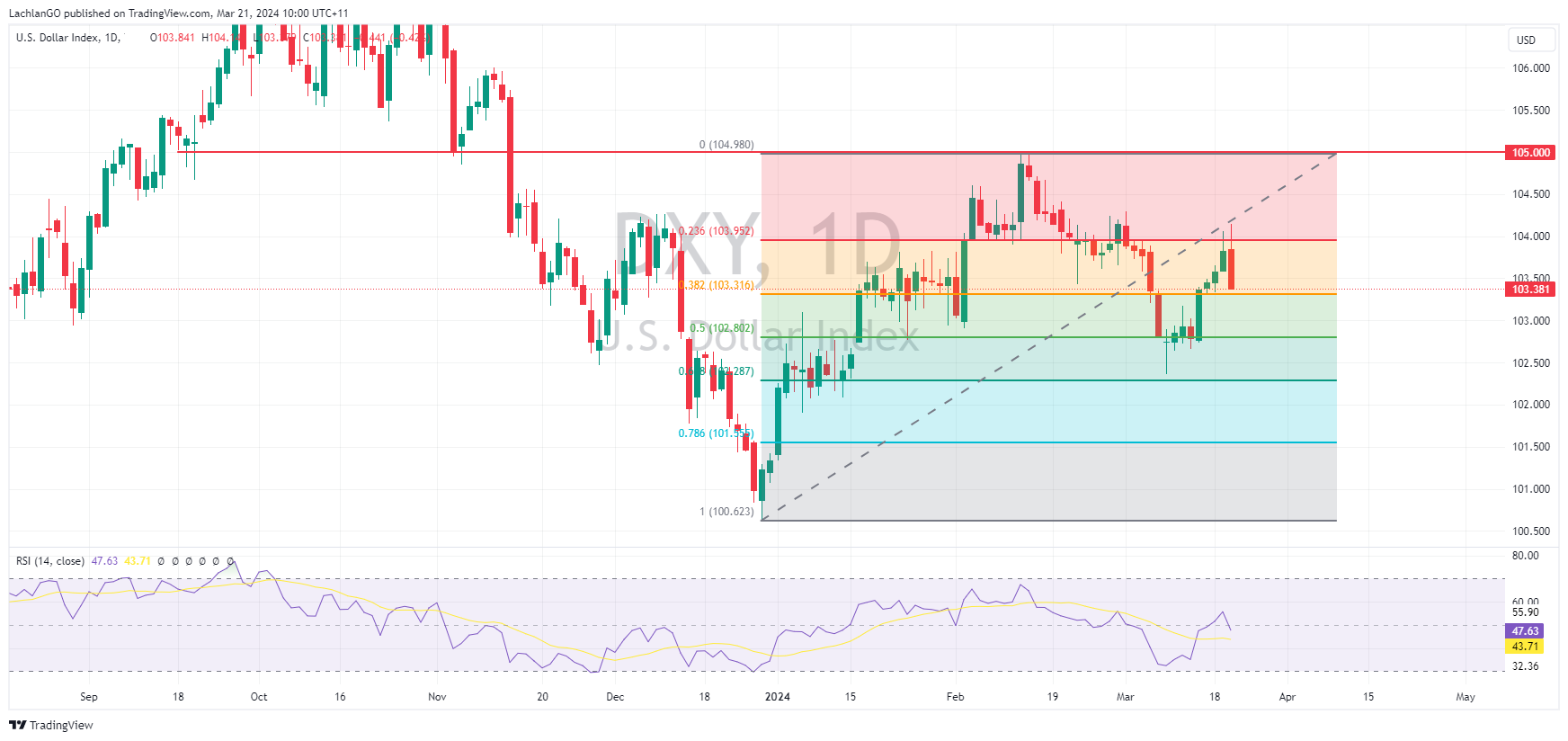 21 March 2024 By Lachlan MeakinUSD was notably lower after what was seen as a dovish FOMC meeting on Wednesday. The Fed 2024 median dot was left unchanged with 3 cuts for 2024 still the Fed forecast but the dovish part came at the presser where Fed Chair Powell downplayed the hot January and February CPI numbers. This dovish tilt saw risk assets surge and the USD dump.