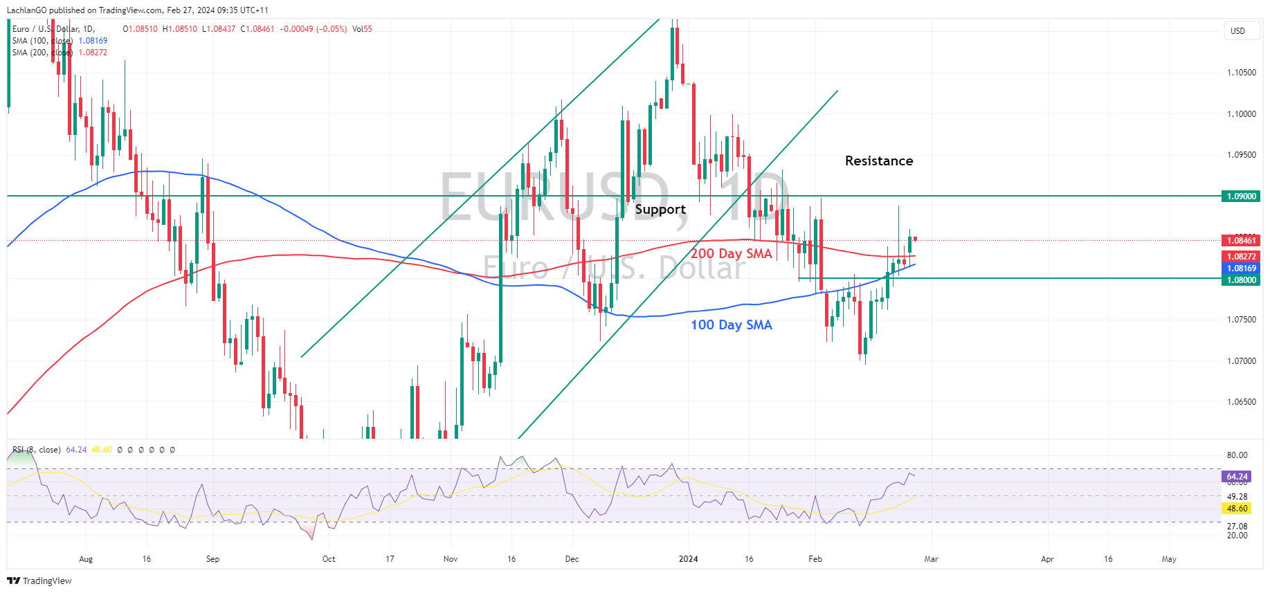 27 February 2024 By Lachlan MeakinUSD sold off on Monday with DXY failing to hold above 104 after finding some resistance at the 100 DAY SMA and dipping from a high of 104.20 to a low of 103.70 where the 200 Day SMA held as support. The move lower in USD came despite higher UST yields, which would normally support the USD.