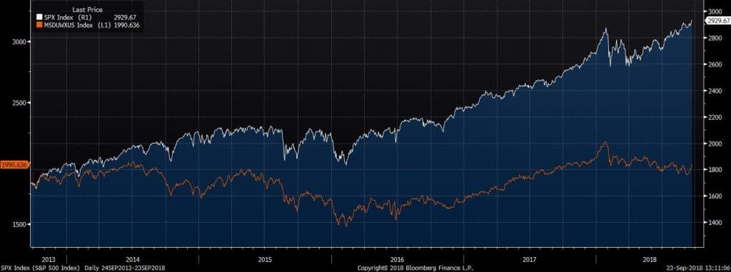 News & AnalysisOn GFC’s 10-year anniversary, one cannot help but wonder about the current dispersion in the financial markets. Developed Markets (DM) equities are now divided between US and non-US, with the US outperforming every other major market. S&P is hovering around its all-time highs whereas DM are still well below their 2018 highs.