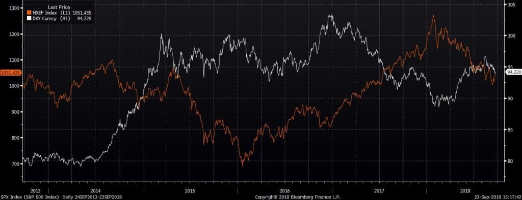 The combination of a higher USD (driven by higher rates in the US) and issues such as the trade war, sanctions and domestic matters in EMs have created a vicious cycle. On one hand, risk-averse investors are selling their emerging market assets due to economic downgrades, slower growth and trade war risks. On the other hand, by repatriating their investments back to the funding currencies (mainly USD), they force emerging market currencies to go lower, which in turn would intrigue more EM assets sales as investors fear their EM asset returns to be diminished by currency depreciation.
