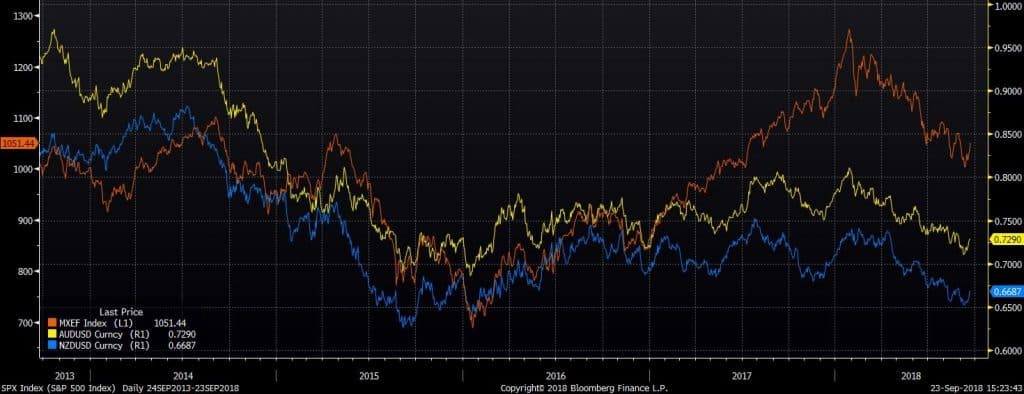 Emerging Market index (Orange and AUDUSD (Yellow) and NZDUSD (Blue)