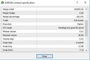b. In the drop-down menu choose “Specification”. This brings up a pop-up with details of the contract information relating to that specific currency pair.
