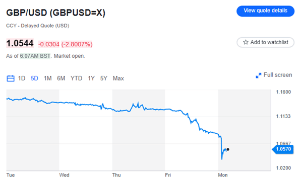 News & AnalysisIt hasn’t been a good Monday morning for some investors or English travelers who wish to sell the GBP to go abroad, as the Sterling Pound has collapsed to record lows to bring almost perfect parity with the U.S Dollar at 1 GBP equals $1.09. Sterling fell to the lowest level in 37 years, trading below the $1.09 following the rate increase.