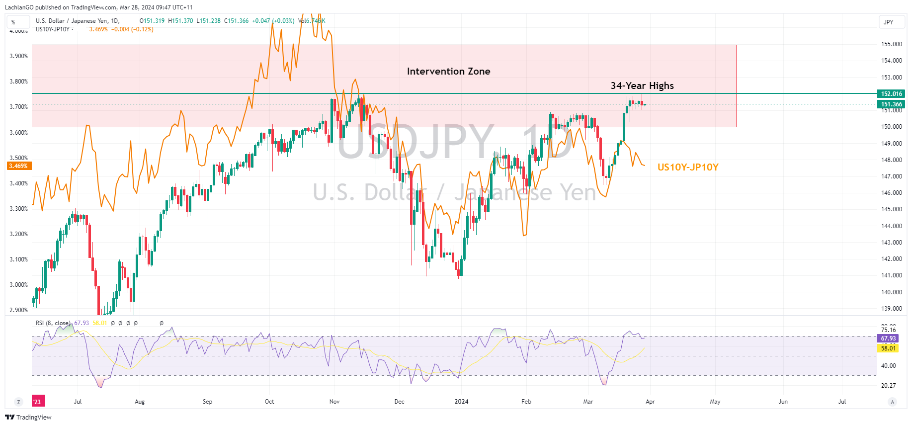USDJPY pushed past its November 2023 high hitting 151.97 which is the highest level this pair has reached since 1990 and bringing intervention speculation to the fore once more, with some trading desks flagging the possibility of intervention during thin Easter markets. Comments from Finance Minister Suzuki who said he was closely watching FX moves and won’t rule out any steps including decisive steps to respond to disorderly FX moves also stoking the intervention fire.