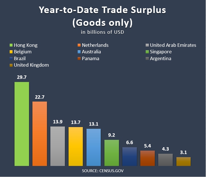 However, there are many countries which the US has a positive trade balance with. It’s largest trade surplus is with Hong Kong at $29.7 billion, followed by the Netherlands. The US exports reached nearly $37 billion with Hong Kong in 2017 (from January to November) with $6.9 billion worth of goods imported. However, some analysts are suggesting that Hong Kong’s trade with the US will suffer from the ongoing tensions between the two largest economies in the world.