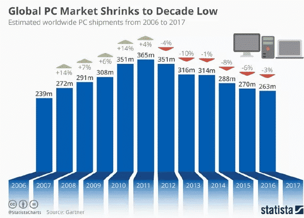 PC sales in 2017 have dropped to 263m, which is even less than the sales of iPhone 1 in 2007.