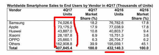 In the 4th Quarter of 2017, the total sales of the Smart Phone market have dropped for the first time. You’ll notice from the chart that every smartphone company value fell, not just Apple and Samsung.