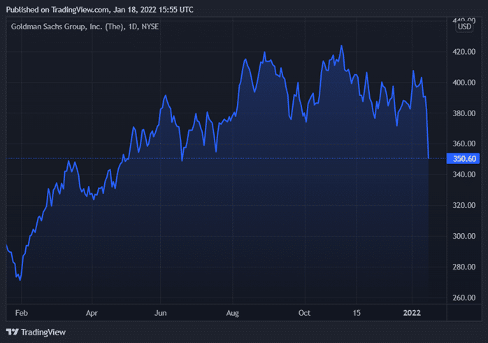 Shares of Goldman tumbled on Tuesday following the latest results, down by around 7%. The stock is up by 19% in the last year at $350.60 per share.
