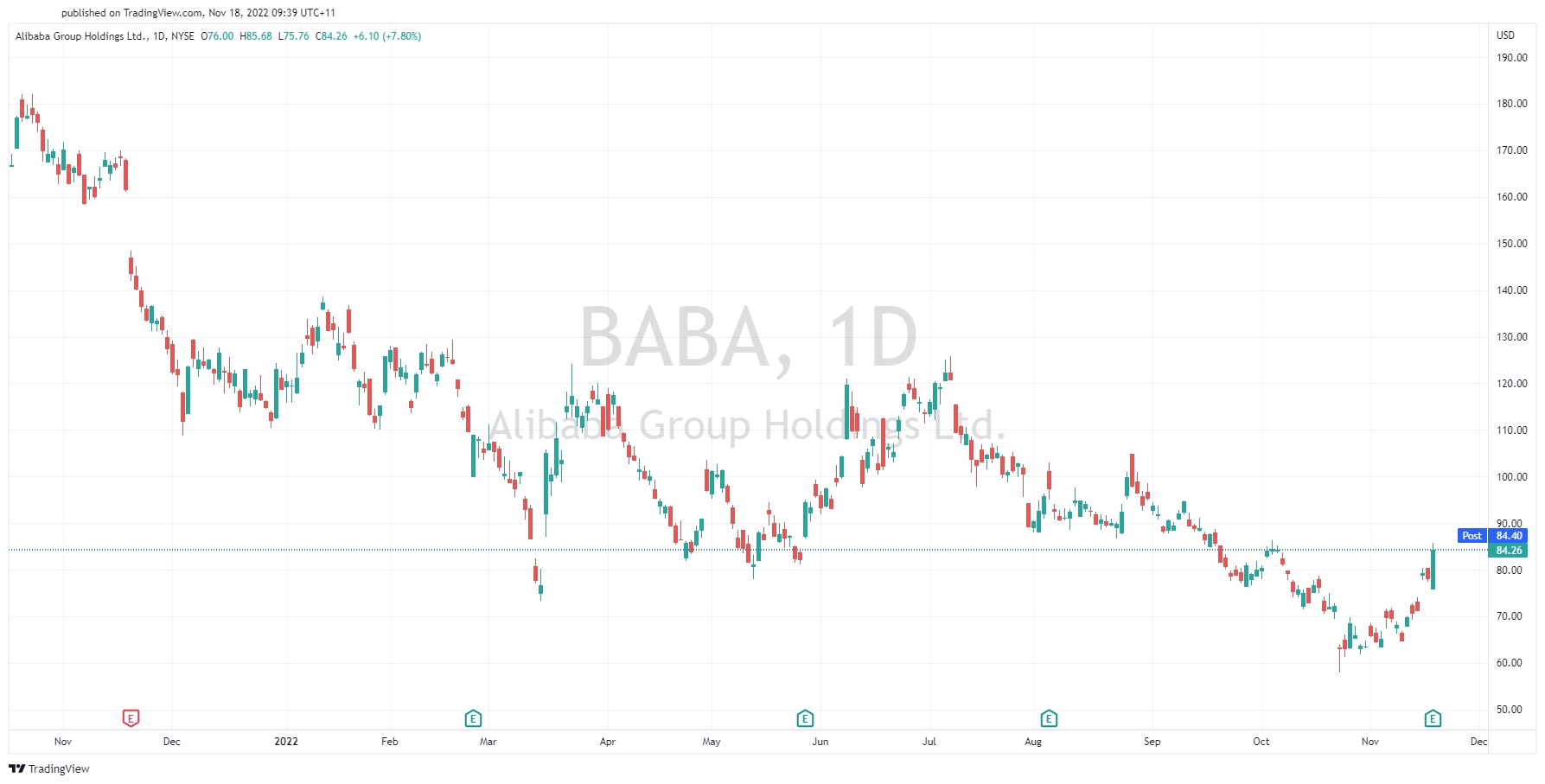 Shares of Alibaba rose on Thursday – up by around 8% at $84.52 a share.