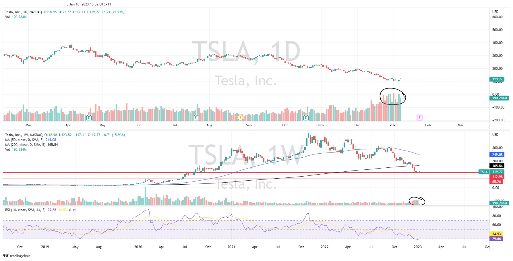 The price chart for Tesla is not particularly encouraging. The price is at levels not seen in more than 2 and a half years. The price is currently at $120 USD and has not yet made a bottom. In fact, the price has fallen below its 200-week moving average a bearish sign. It is resting on a support region at 110-120 dollars and if it fails its next support is at $65. The volume of selling has been quite aggressive. At this stage until, there is some sort of support or buying volume it remains a more favorable short then long. However, if the price can find support at $110 it may bounce and begin a reversal.