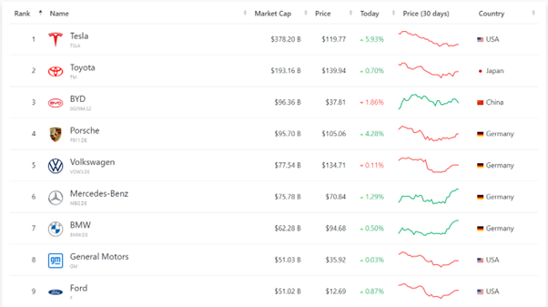 Company PE Ratio BMW 3.11 Volkswagen 4.14 Toyota 9.19 Ford 5.70 Tesla 31.3 Price Action analysis