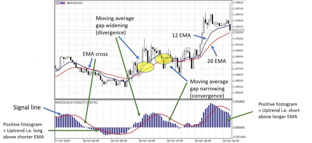 Here we see a GBPUSD 15-minute chart. There are two exponential moving averages (EMA) namely a 12 and 26 (the reason for this will become obvious in a moment.