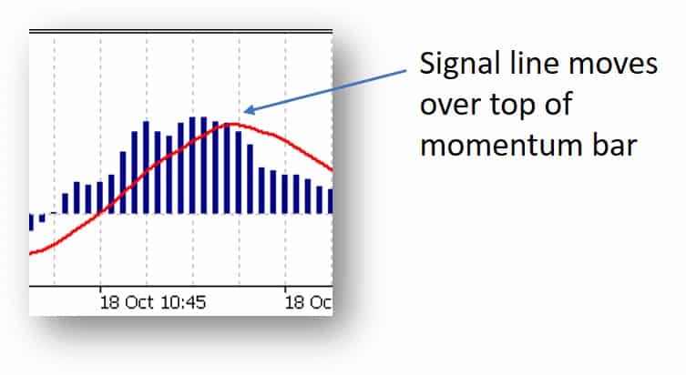 To help explain the potential use of this “signal line” let’s use the diagram below which is a “snip” taken from part of the chart as it moves into uptrend.At the start of the uptrend, we see the histogram bar tops over the signal line. As the signal line is a SMA of the height of the bars you note it tracks upwards along with the increased momentum.