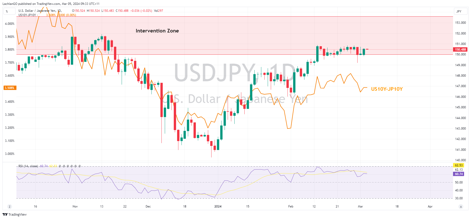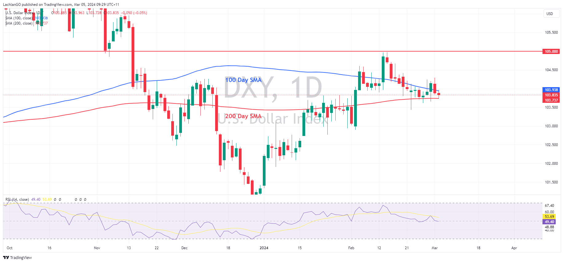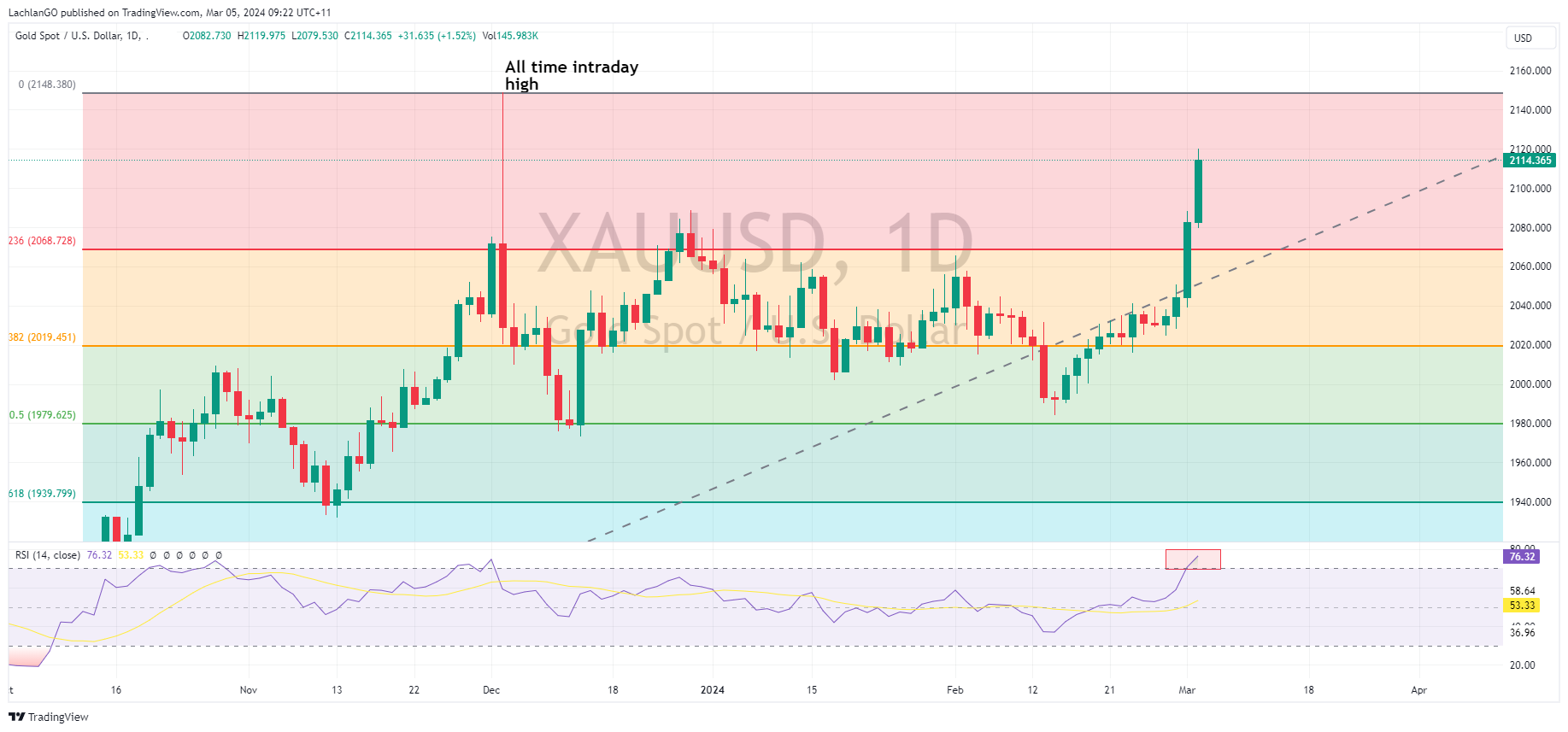 5 March 2024 By Lachlan MeakinGold surged again in Monday’s session despite a rise in US Treasury yields and setting a new closing high. There was little fundamental news to drive the rally though a comparable surge in the Crypto markets has seemingly given the other “alternative” currency a tailwind. This is four up sessions for gold and with momentum behind it is eyeing the all-time intraday high set back in December of 2049 USD an ounce, though XAUUSD is trading at extreme overbought levels on the RSI.