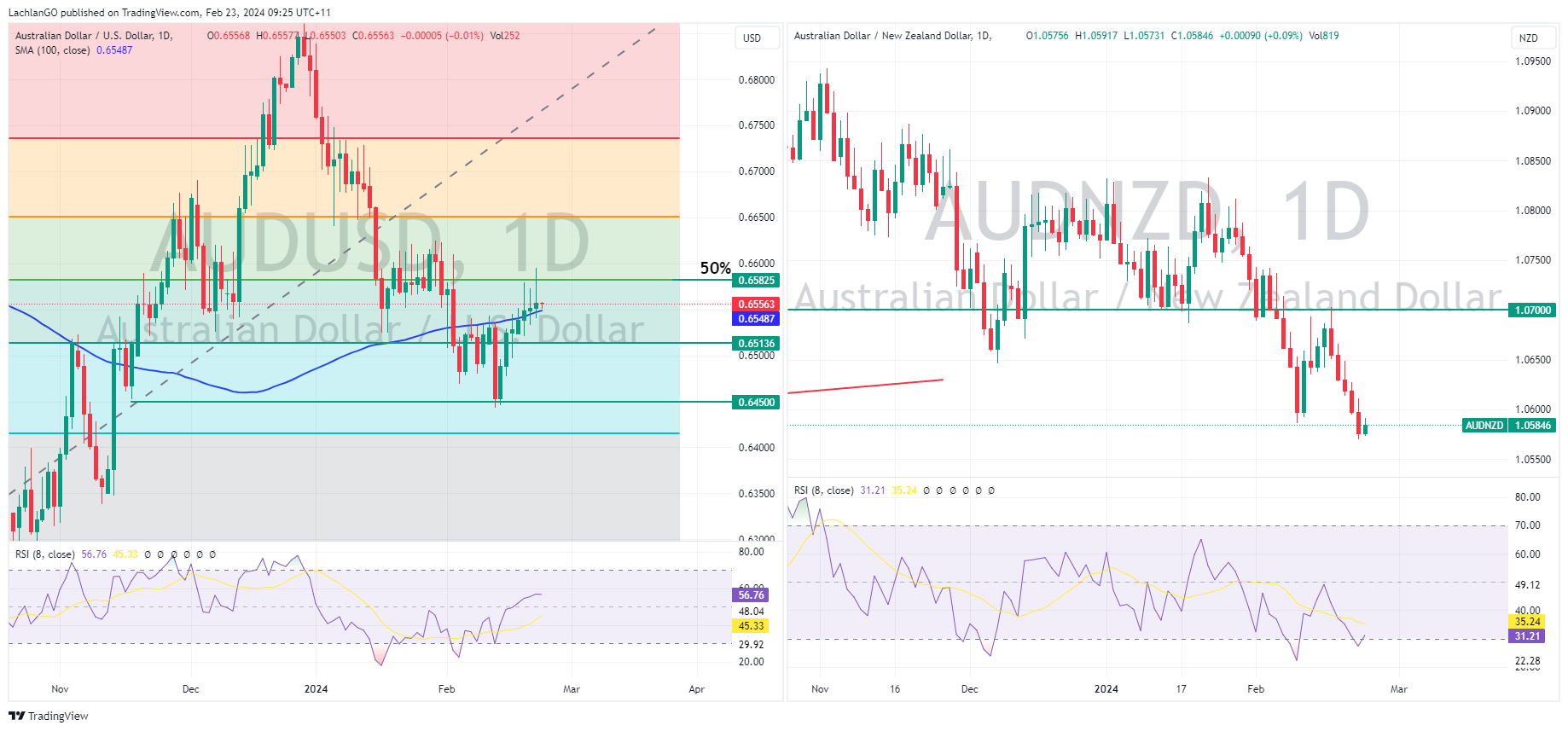 23 February 2024 By Lachlan MeakinUSD was ultimately flat in Thursdays session after a rollercoaster of a ride, DXY printed a low in the European session of 103.43 before rallying up to the 100 Day SMA at 104.10 after better than expected US Jobless claims. Flash PMIs for February were mixed with a fall in Services but a rise in Manufacturing, DXY heading into the APAC session just below the 104 level.