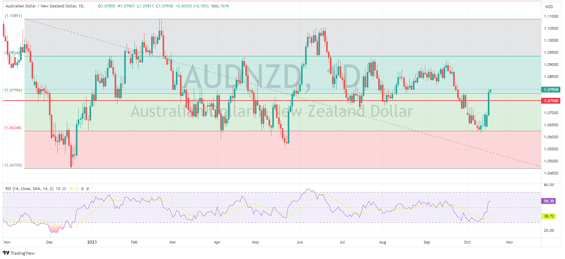 AUDNZD surged higher, retaking the key 1.07 level and within a whisker of also breaching 1.08
