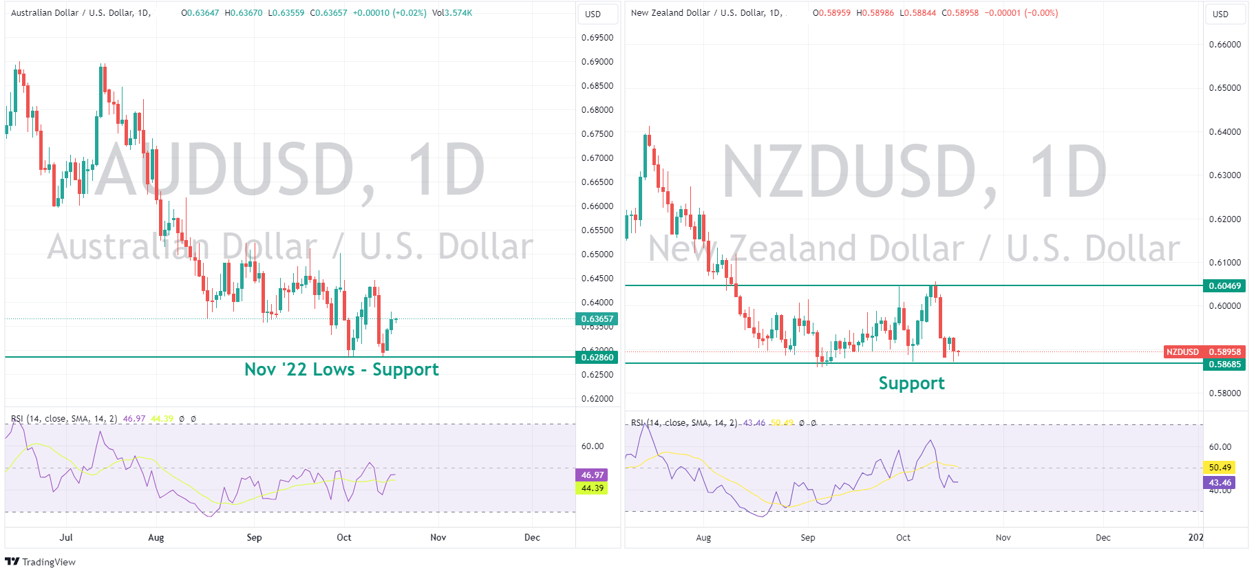 AUD and NZD were divergent on Tuesday, with the Aussie the G10 outperformer and the Kiwi the laggard. AUDUSD continuing its bounce off the major support at 0.6286 to rally to a high of 0.6380, helped along by what was seen as hawkish RBA minutes released during the session. NZDUSD on the other hand struggled after a not as hot as expected NZ CPI, NZDUSD dipping to test the October lows at 0.5871 before finding some support..