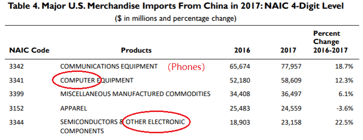 According to the U.S. Census Bureau, U.S. imports of ATP from China in 2017 totaled $171.1 billion. Information and communications products (i.e., Phones and Pads) were by far the most significant U.S. ATP import from China, accounting for 91% of U.S. ATP imports from China and 60% of U.S. global imports of this category (see table below).