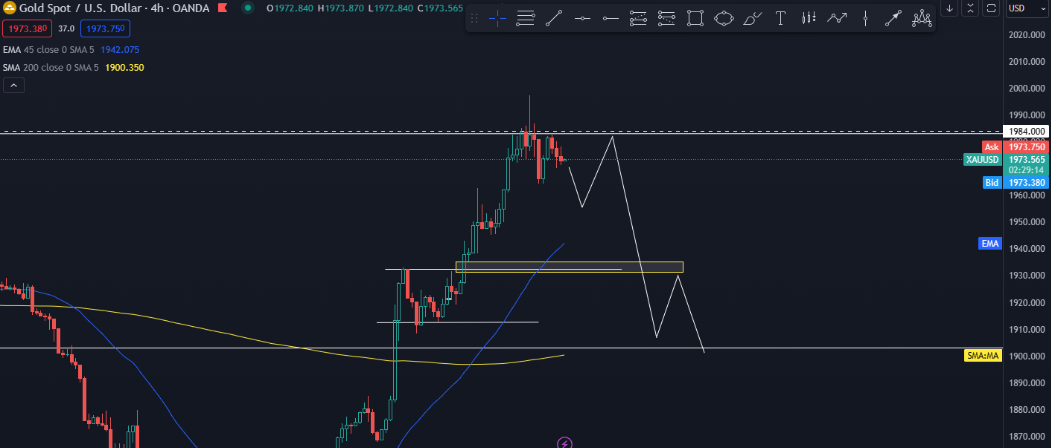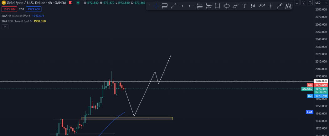 In the market, assets tend to move in one of three directions: up, down, or sideways, often referred to as consolidation. Given that gold has reached its previous peak, it may seek potential support, which appears to be around 1930-1931. Concurrently, the US Dollar is experiencing a decline in value.