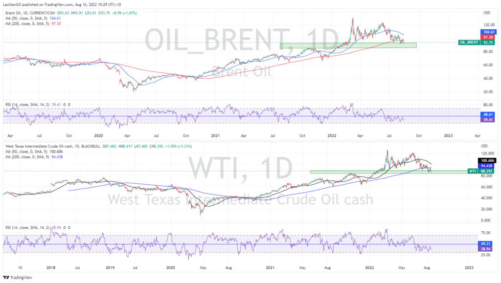 The recent drop has pushed the price of both Crude and WTI to 6-month lows not seen since before the Russia and Ukraine crises. On the daily chart, both Brent and WTI are sitting on areas of support between $85-$93 and $83-$90 respectively. The price for both Brent and WTI has also dipped below the 200-day moving average indicating a medium-term bearish shift. The question remains, is this just a retracement, or a reversal of exhaustion? Due to the prices being resting near their area of support and the RSI consolidating between 25-45, this does indicate a possible bounce. If the RSI can break above the recent consolidation/range or 45 and the general price of the commodity can bounce off its support, there may be the potential for buying opportunities.