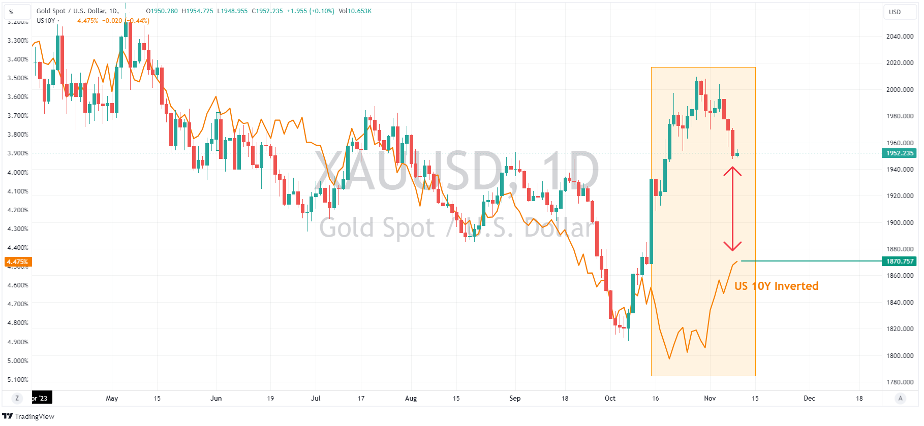 The chart below shows the strong relationship between the inverted US 10-Year yield and gold and is clear where haven demand and risk premium pushed gold higher away from the fundamental relationship it has with this yield (highlighted in orange box). This gives us a clue of where the fair value of gold is without the conflict driven buying. A trading opportunity for a “gap fill” trade of the inverted yield and the gold price opens up.
